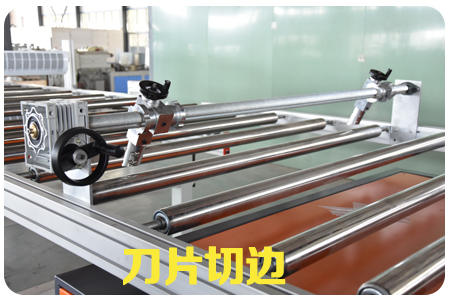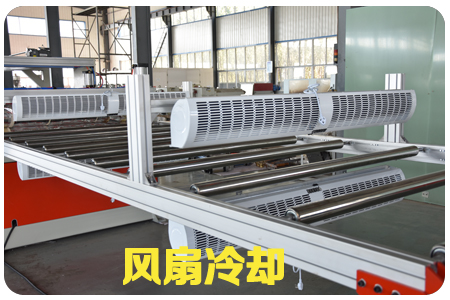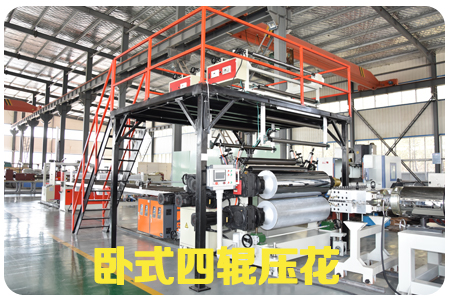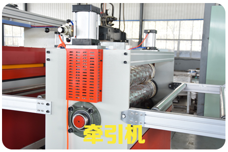 SPC石塑地板生產(chǎn)線,由擠出機、模具、四輥成型機、冷卻系統(tǒng)、牽引機、新一代精加工自動定長切割機、自動成品卸料臺等組成,全自動化控制。SPC石塑地板由擠出機擠出PVC的基材,用四輥壓延機組,分別把PVC彩膜+PVC耐磨層+PVC底膜,一次性壓貼復(fù)合而成的產(chǎn)品,工藝簡單、貼合靠熱量完成,不含膠水。在由擠出機擠出,在線實現(xiàn)表面覆膜工藝后,再經(jīng)過多片鋸分切(因為長度已經(jīng)固定,只需要縱向多片鋸),然后縱橫向開槽,再表面油漆UV(一般做兩個道)最后包裝入庫。